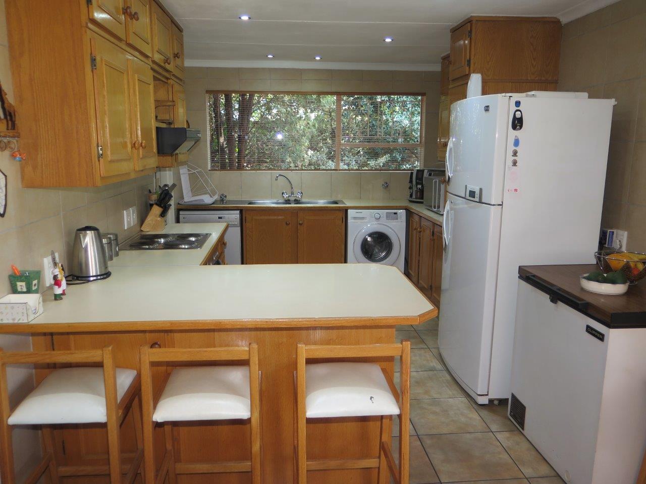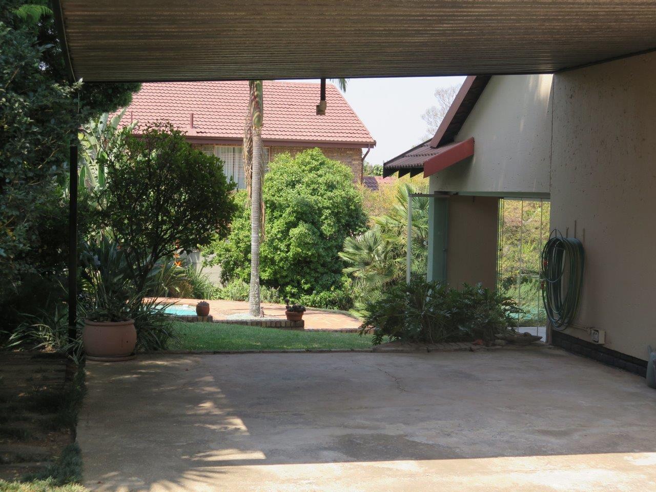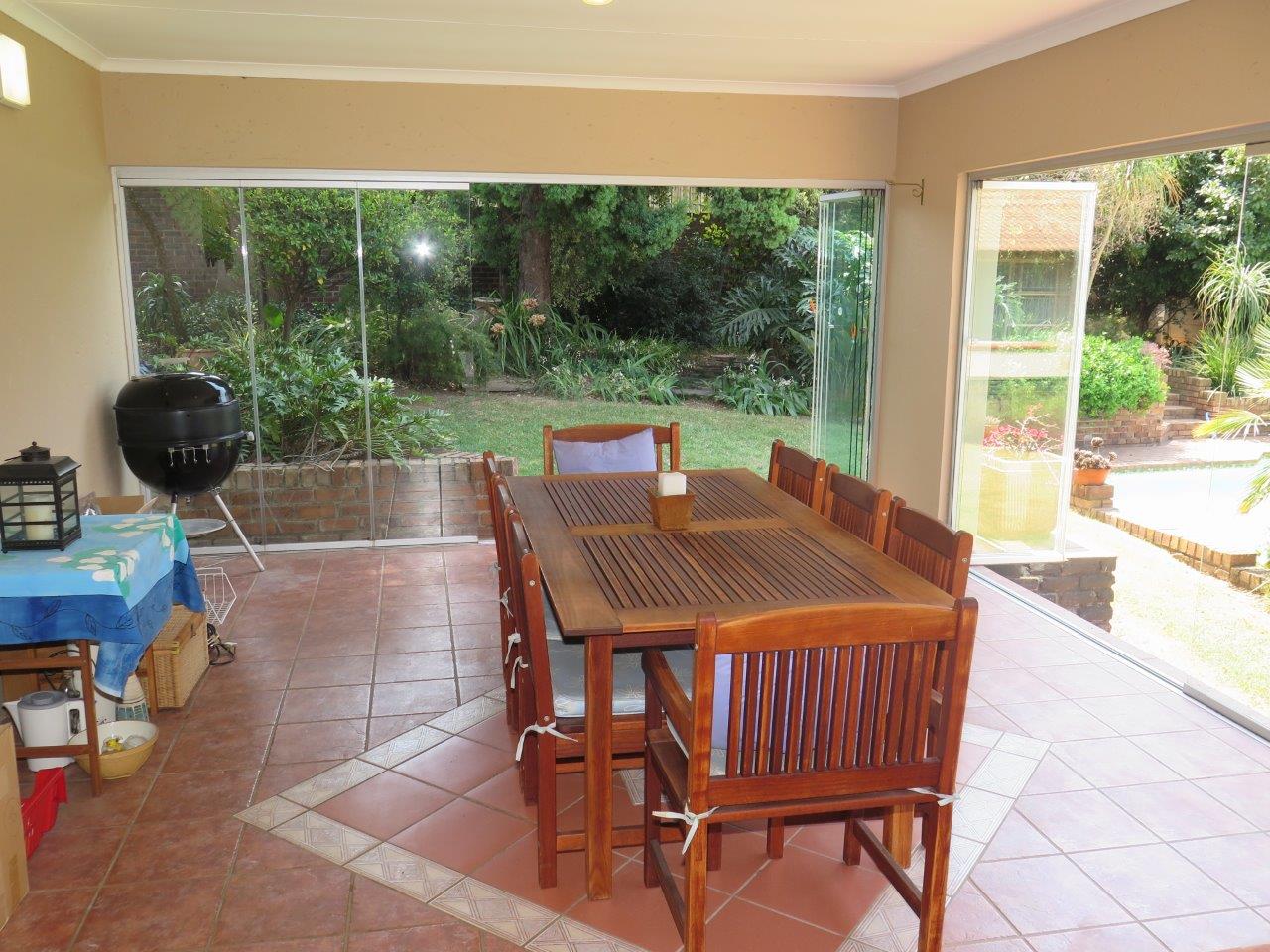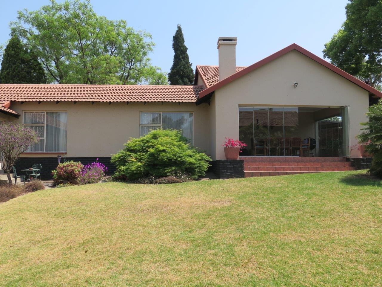 It offers: 4 Bedrooms (Main bedroom has wood laminate flooring and dressing area) * PLUS work from home or 5th Bedroom *3 bathrooms (2 en suite; 2nd bathroom is full)* Formal lounge* Separate dining room* TV room with wood laminate flooring* Open solid oak kitchen with a breakfast bar (2 appliances)* Walk-in pantry * Covered patio enclosed with sliding glass stack doors* Built-in braai on patio* Swimming pool* Large developed treed water-wise garden* Manual irrigation system * Full staff accommodation *Double auto garage and 2 double carports* Alarm system and security gates* Electric fence all round the property* Auto front gate.