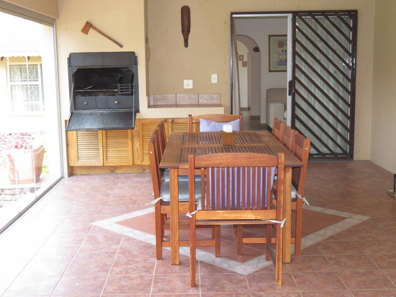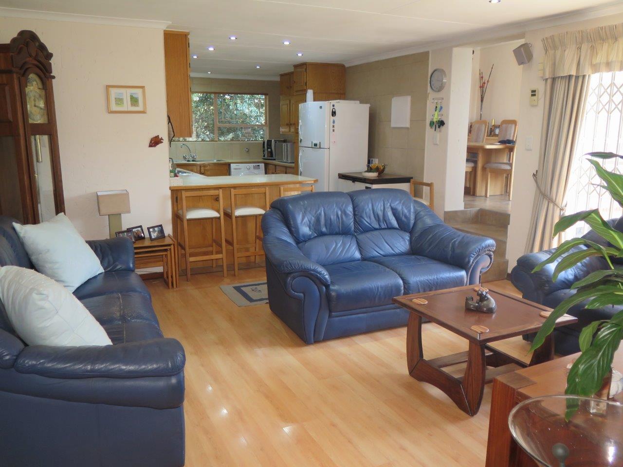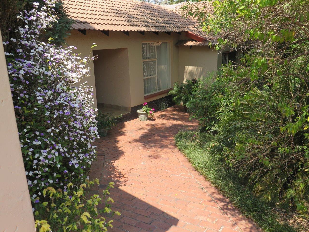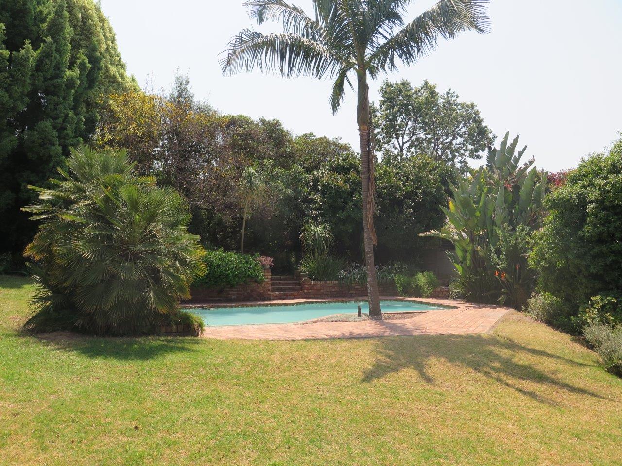It offers: 4 Bedrooms (Main bedroom has wood laminate flooring and dressing area) * PLUS work from home or 5th Bedroom *3 bathrooms (2 en suite; 2nd bathroom is full)* Formal lounge* Separate dining room* TV room with wood laminate flooring* Open solid oak kitchen with a breakfast bar (2 appliances)* Walk-in pantry * Covered patio enclosed with sliding glass stack doors* Built-in braai on patio* Swimming pool* Large developed treed water-wise garden* Manual irrigation system * Full staff accommodation *Double auto garage and 2 double carports* Alarm system and security gates* Electric fence all round the property* Auto front gate.