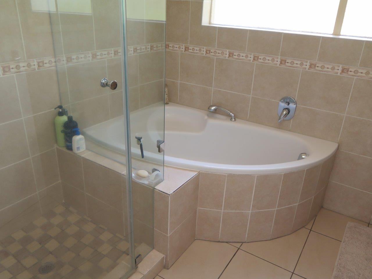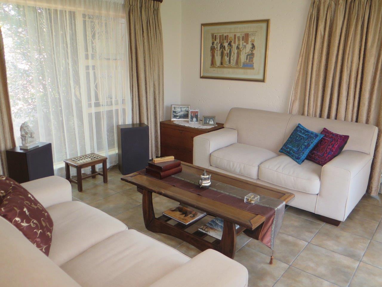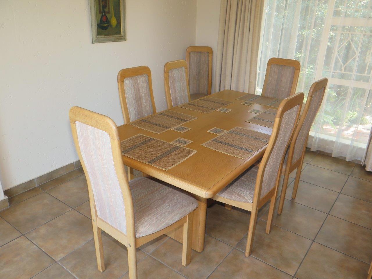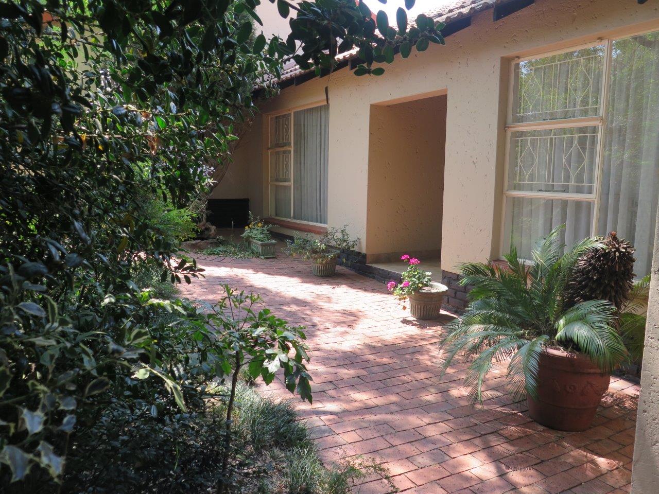 It offers: 4 Bedrooms (Main bedroom has wood laminate flooring and dressing area) * PLUS work from home or 5th Bedroom *3 bathrooms (2 en suite; 2nd bathroom is full)* Formal lounge* Separate dining room* TV room with wood laminate flooring* Open solid oak kitchen with a breakfast bar (2 appliances)* Walk-in pantry * Covered patio enclosed with sliding glass stack doors* Built-in braai on patio* Swimming pool* Large developed treed water-wise garden* Manual irrigation system * Full staff accommodation *Double auto garage and 2 double carports* Alarm system and security gates* Electric fence all round the property* Auto front gate.